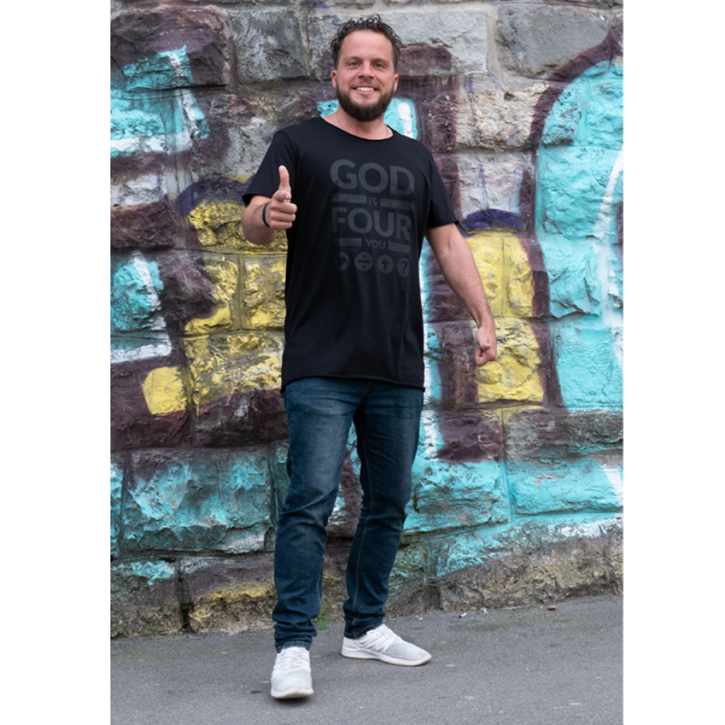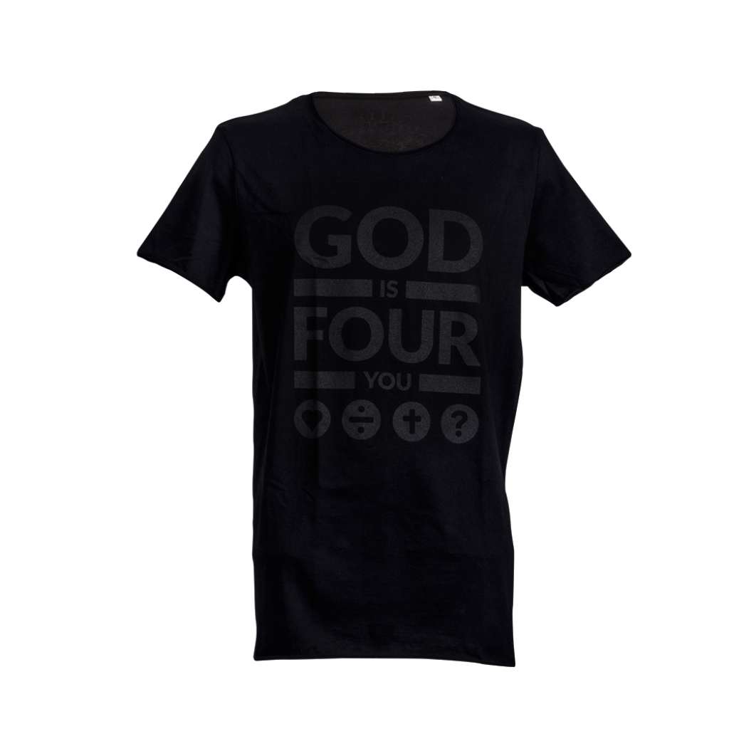 Tryck på framsidan: svart «GOD IS FOUR YOU» design