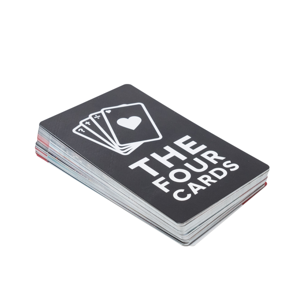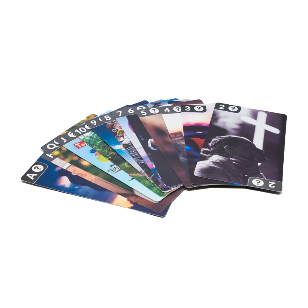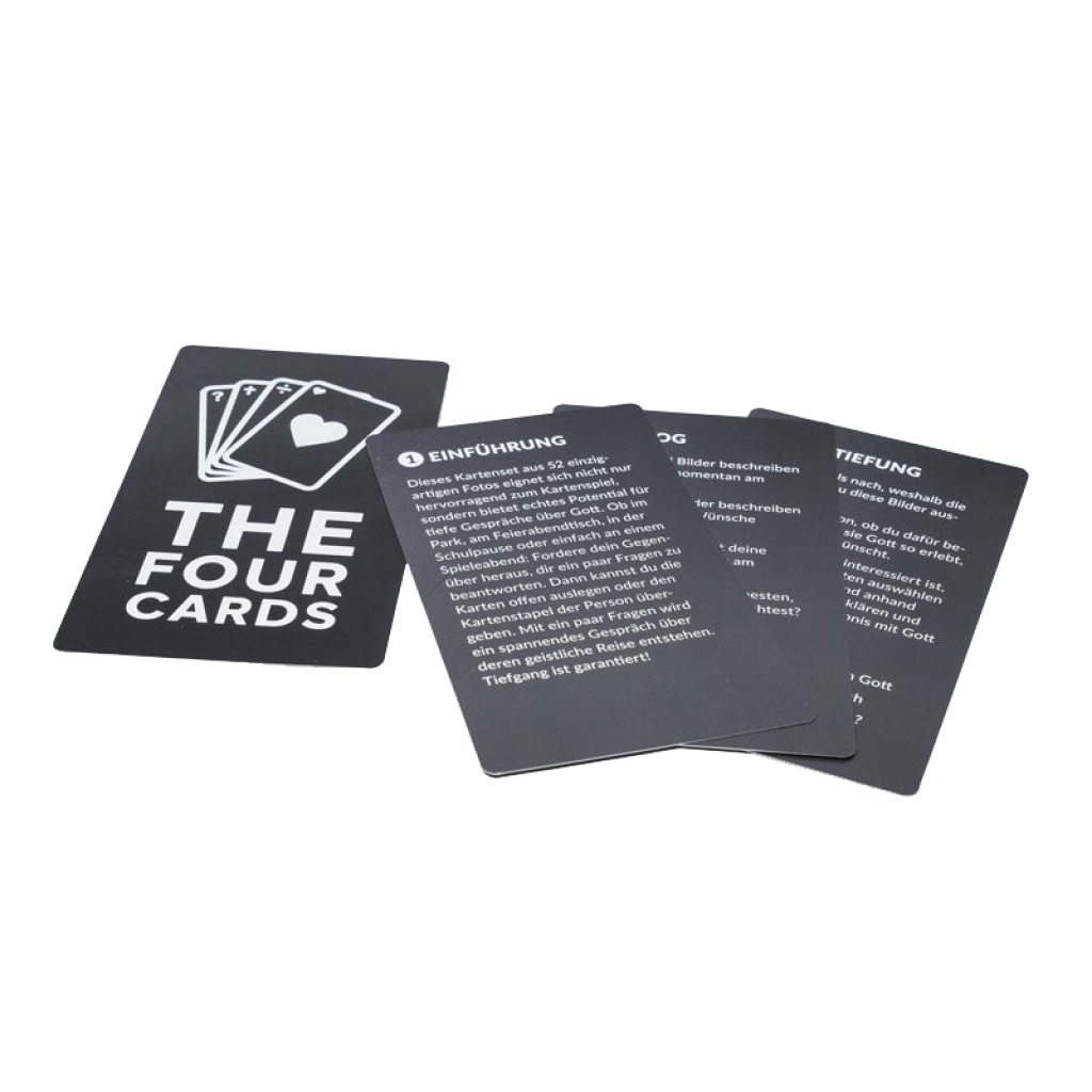 THE FOUR Cards är en ny utgåva av den framgångsrika klassikern “Soularium”. Dessa kort är designade i pokerkortsstil och är perfekta för det vanliga kortspelet. Men du kan också lägga dem ut i gågatan. Förbipasserande blir nyfiken och kommer mot dig själv. Om du vill delta i ett kort utbyte kan du välja en eller tre bilder att svara med några frågor. Bilderna börjar prata och plötsligt pratar du om allt som verkligen berör dig: livet, dina drömmar, Gud och världen. Knappast något annat verktyg öppnar människor upp så snabbt som här. För det mesta kan du be för dem och förklara FYREN för dem med fyra bilder. Således är dessa kort en unik möjlighet att prata med varandra – vare sig det är i parken, på gatan eller under en spelrunda med vänner.