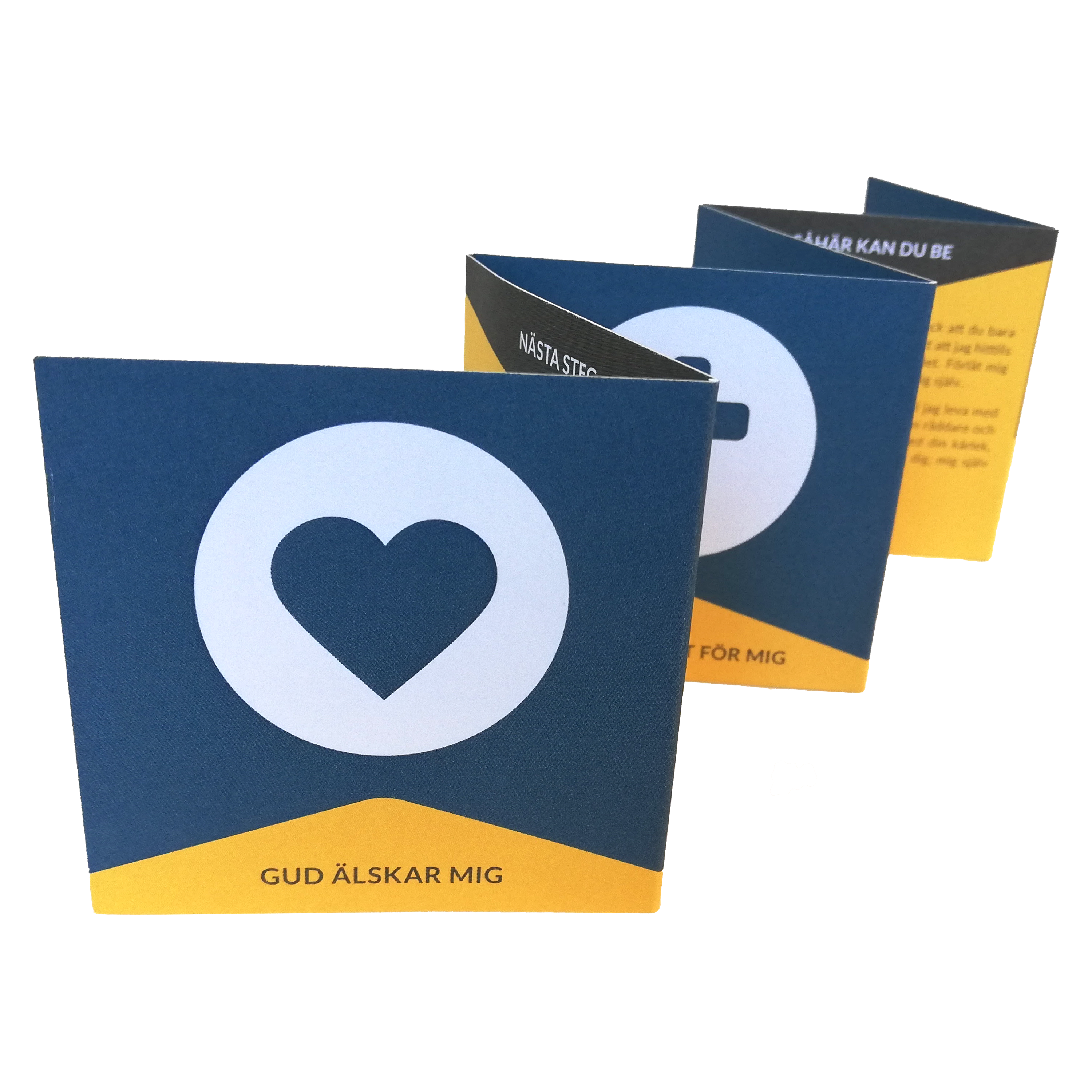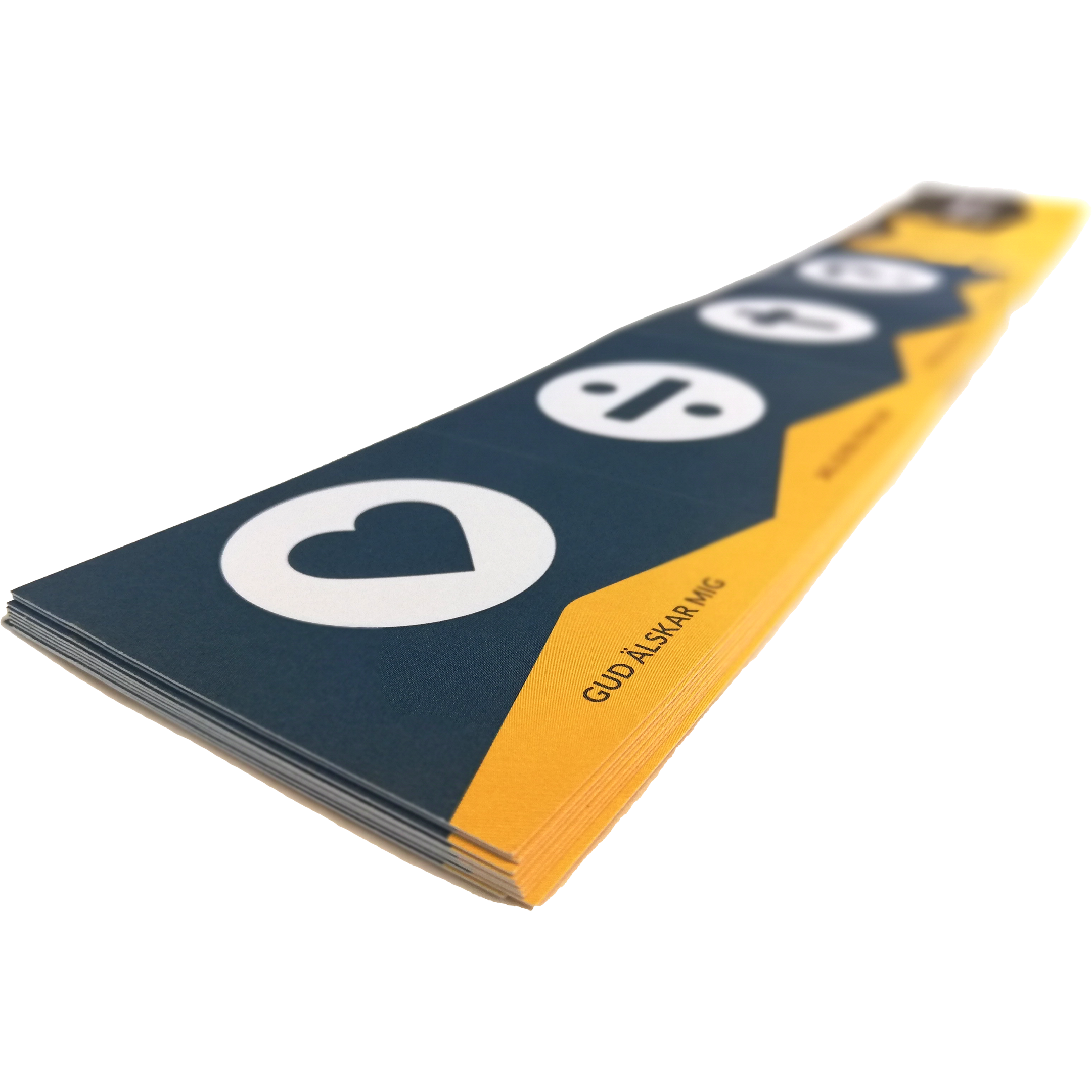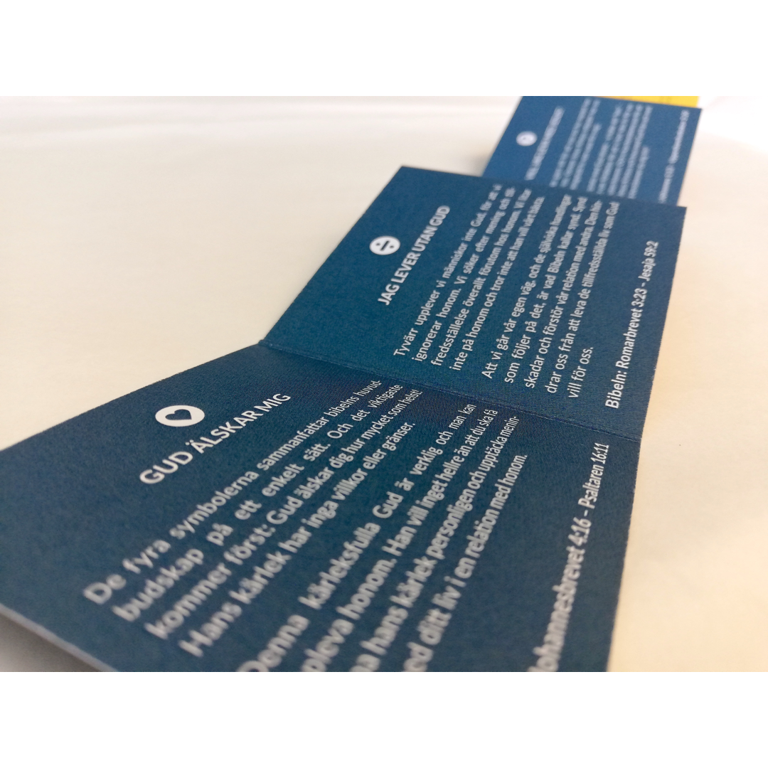 Flyern levereras ovikt men är anpassade för att enkelt kunna vikas till 65 mm x 65 mm, vilket gör att den även får plats i plånboken!