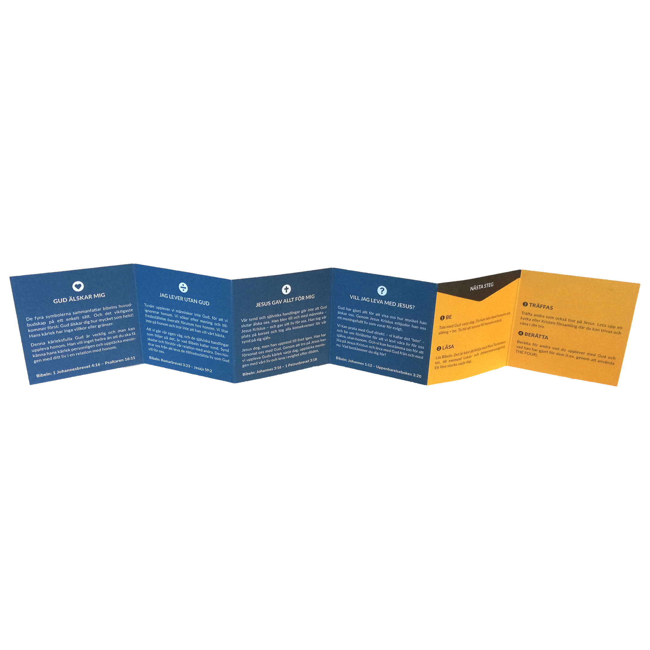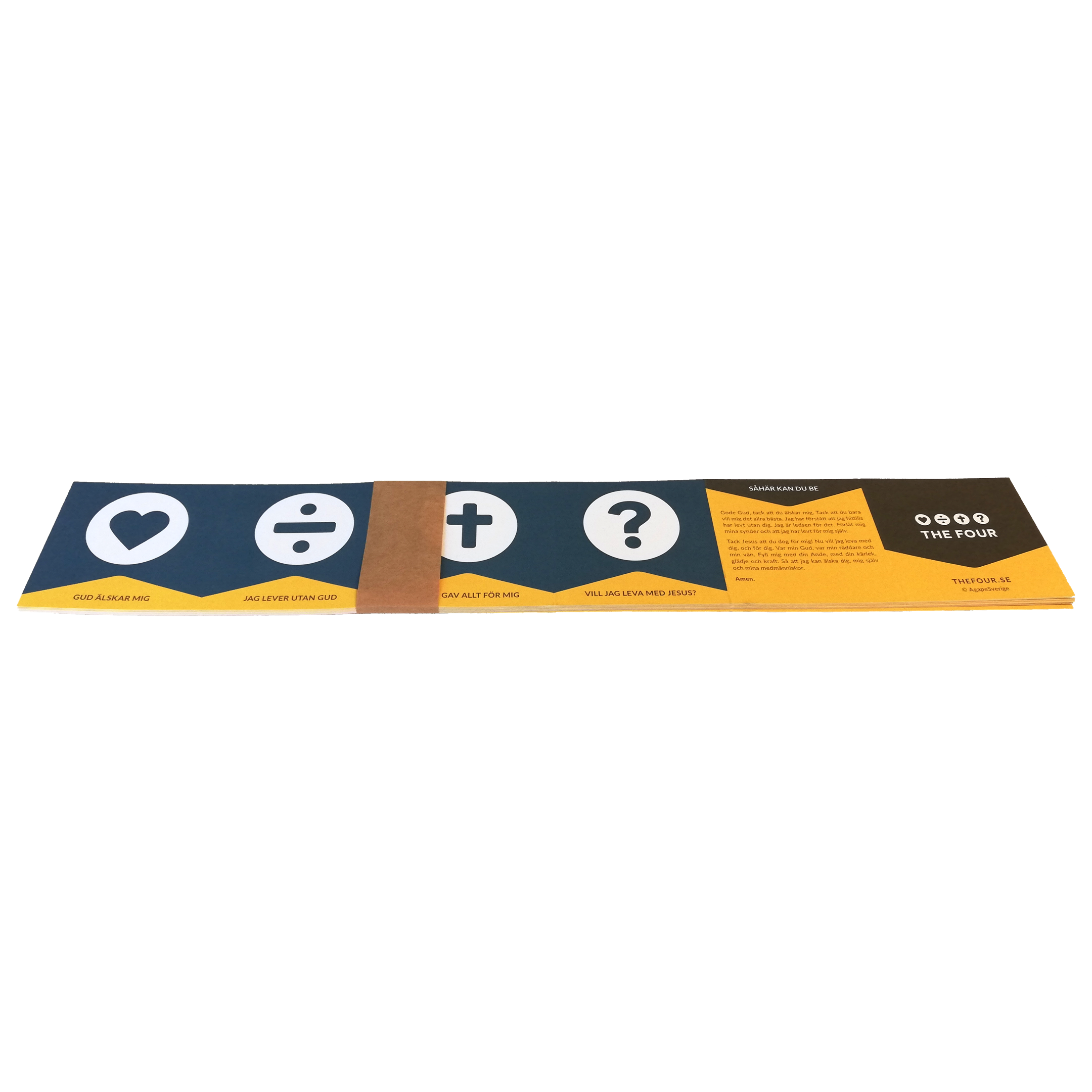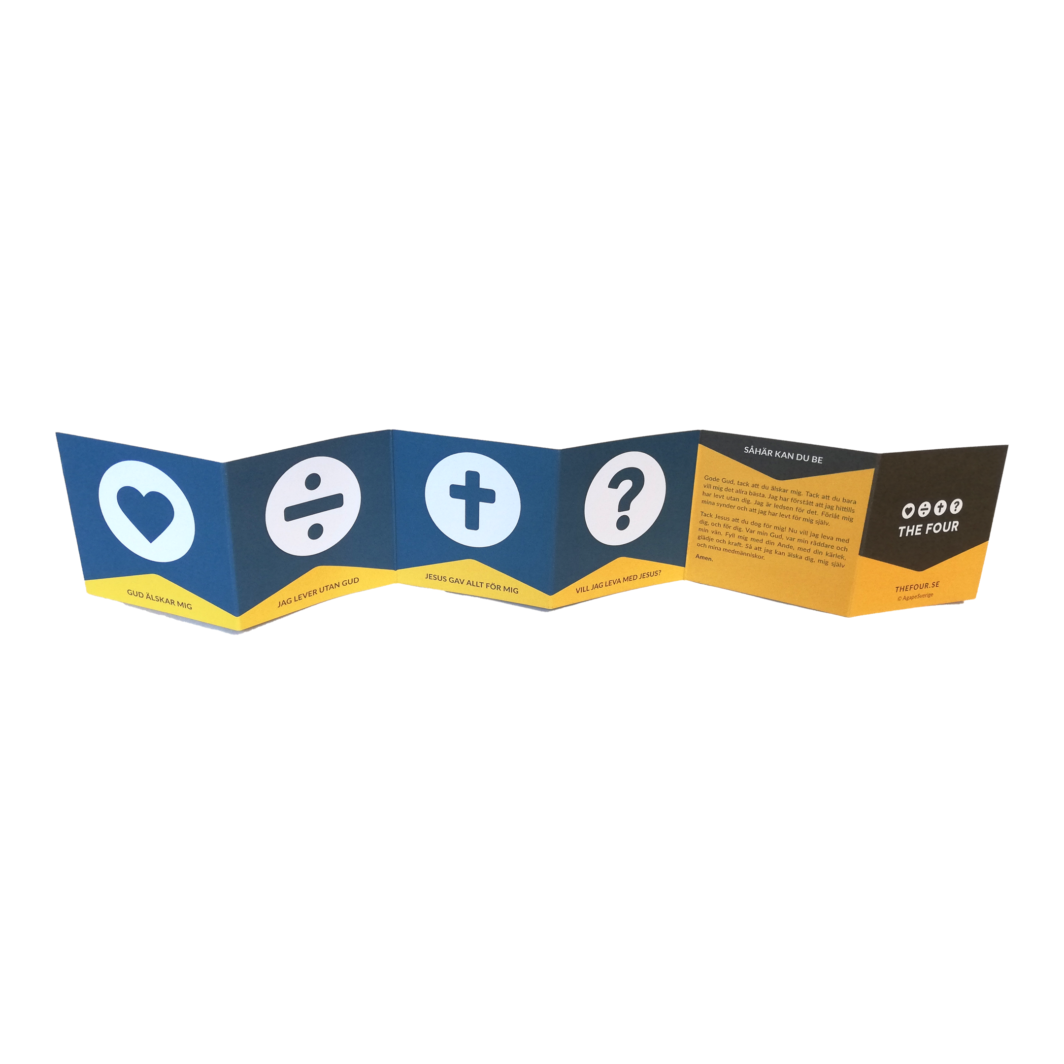 Med denna sex-sidiga flyer kan du enkelt och snabbt dela det bästa budskapet om Jesus Kristus! Perfekt för att ge bort eller själv använda! Innehåller en kort förklaring av de fyra THE FOUR symbolerna som beskriver evangeliet med bibelverser för varje symbol och en enkel bön i slutet. Denna broschyr innehåller också värdefulla tips för att följa Jesus.